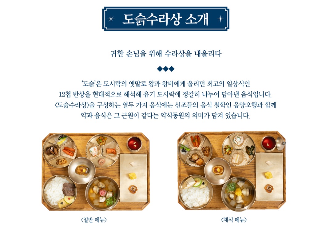 옛말로 '도시락'을 뜻하는 '도슭'은 왕과 왕비에게 올리던 12첩 반상을 현대적으로 해석하여 유기 도시락에 정갈히 담아낸 음식상을 말한다. 도슭수라상에 올라가는 열두 가지 음식에는 선조들의 음식 철학인 음양오행과 약식동원의 의미가 담겨 있다고 한다.