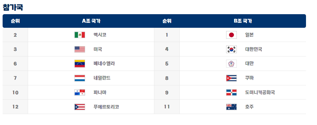 한국, 일본, 미국, 대만, 멕시코, 도미니카 공화국, 베네수엘라, 네덜란드, 쿠바, 파나마, 호주, 푸에르토 리코의 야구팀이 출전합니다.